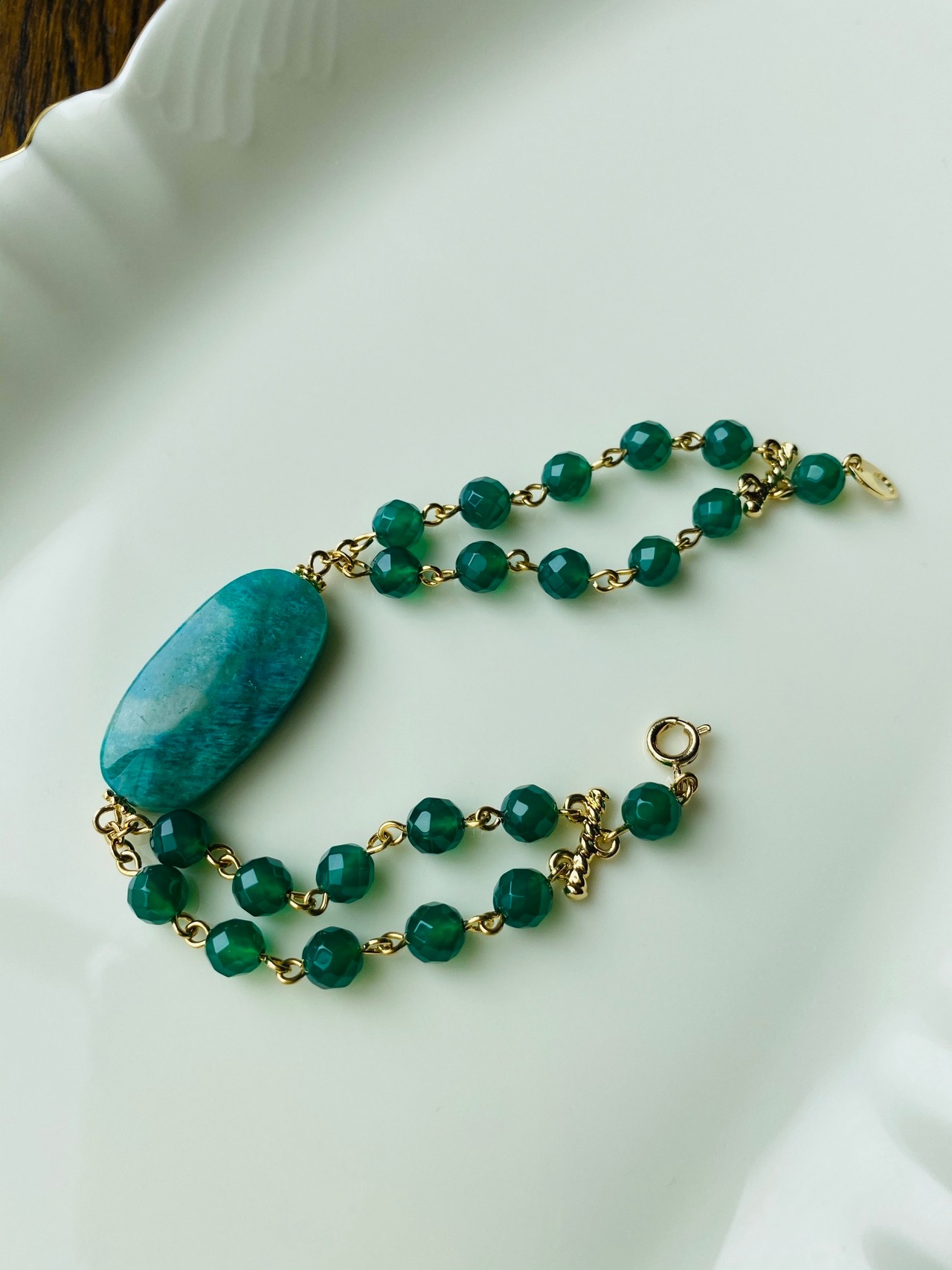 つるんとしてフラットなアマゾナイトに対し、グリーンクオーツの細かなカットは輝きと華やかさを添え、違和感なくまとまっています。