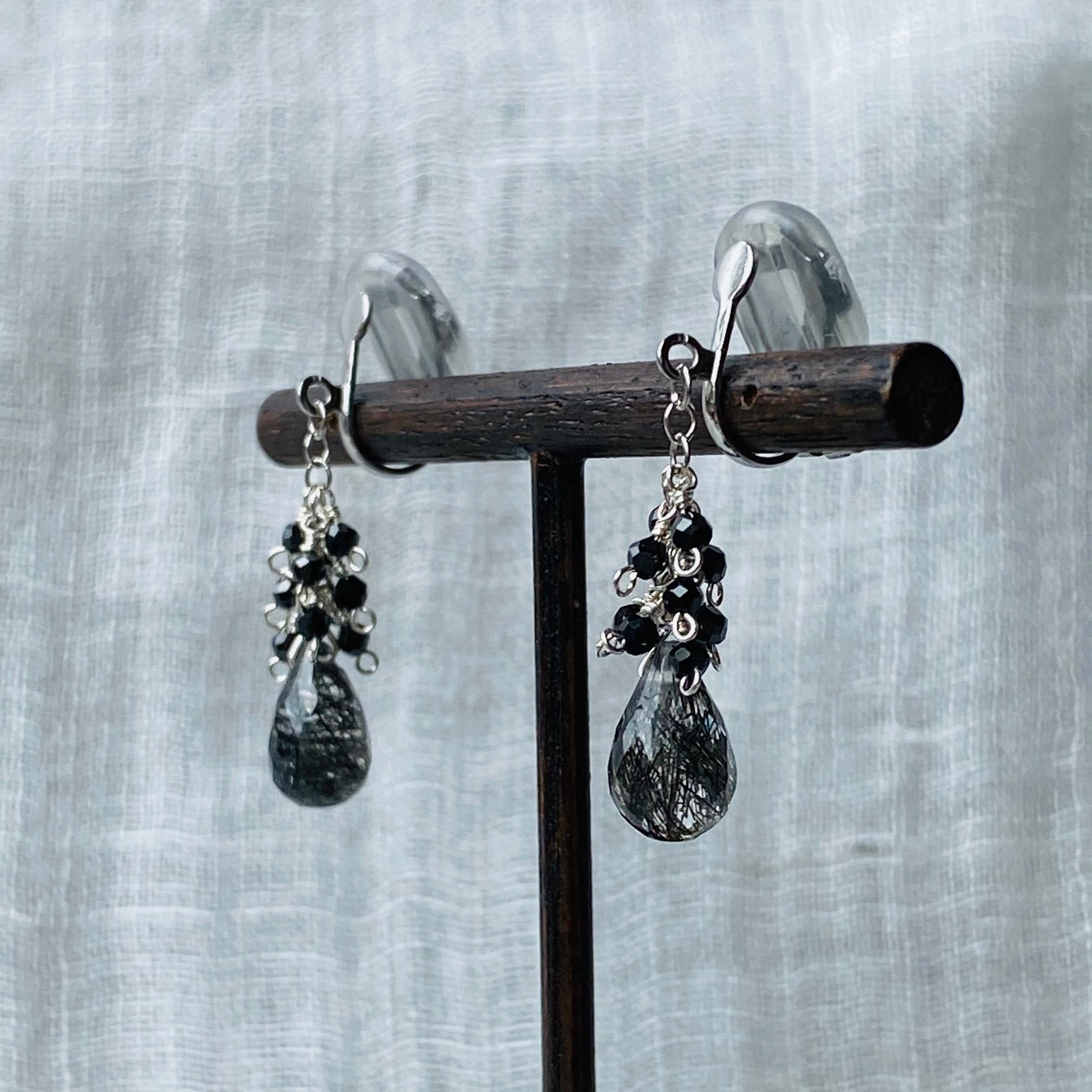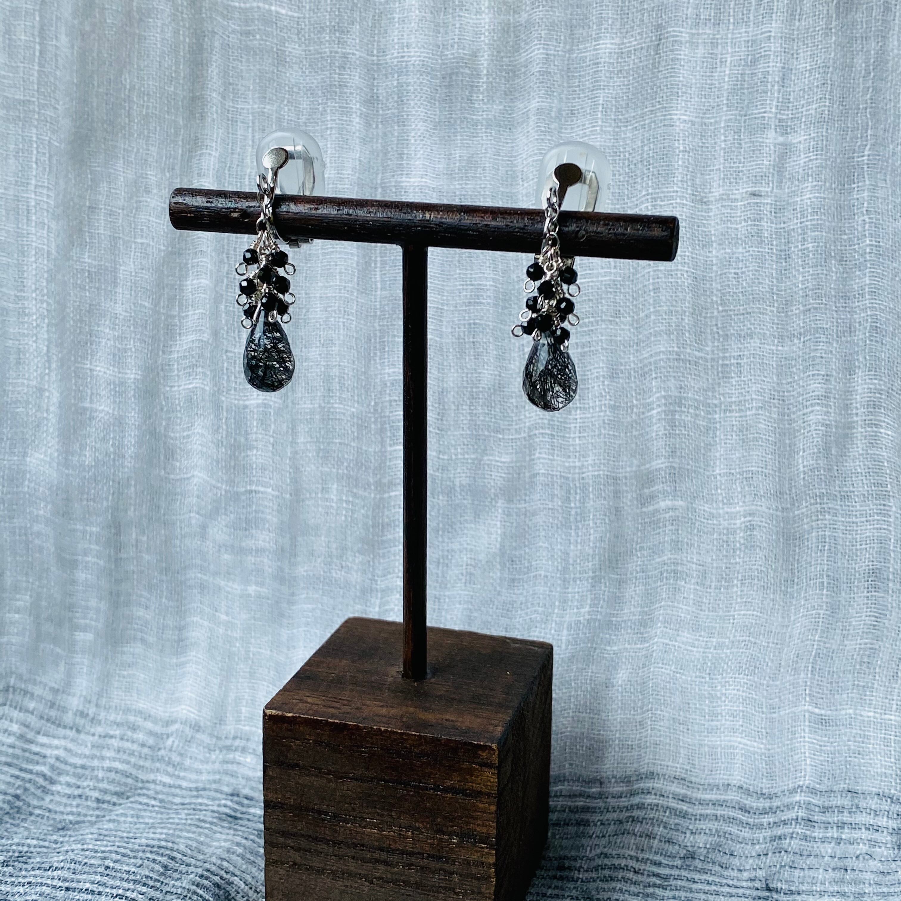 ブラックルチルクオーツ、ブラックスピネルイヤリング