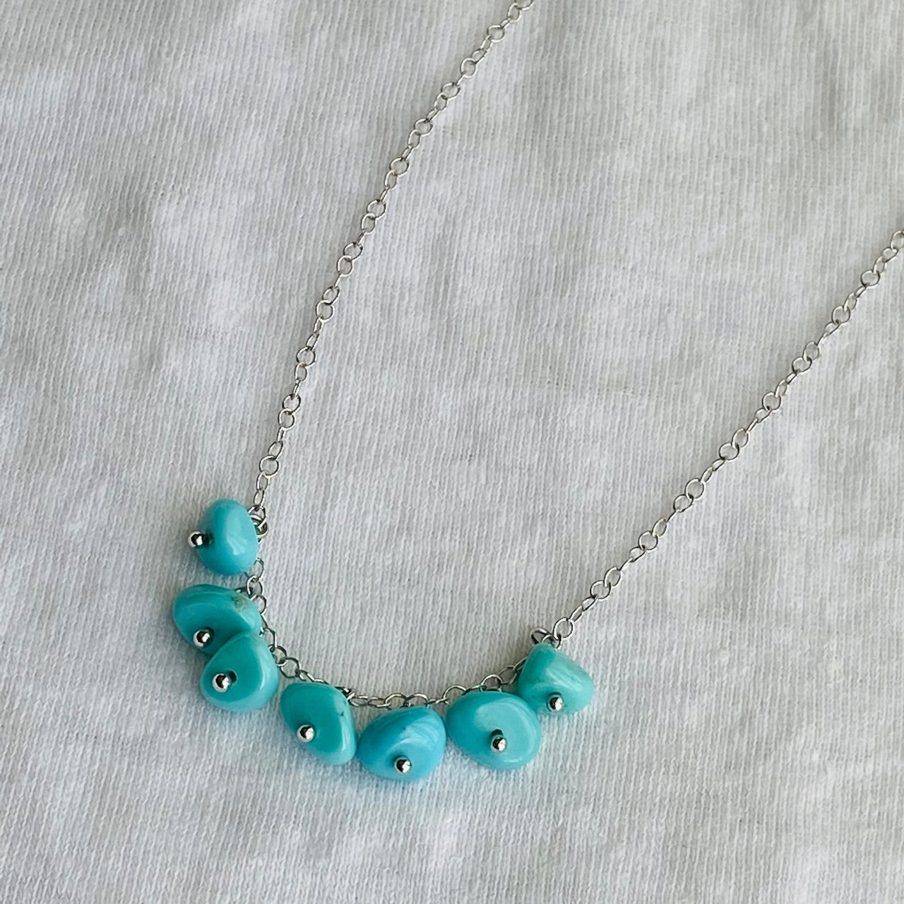 不揃いのコロンとしたターコイズが並んだ様子が可愛らしく爽やかなネックレスです。
