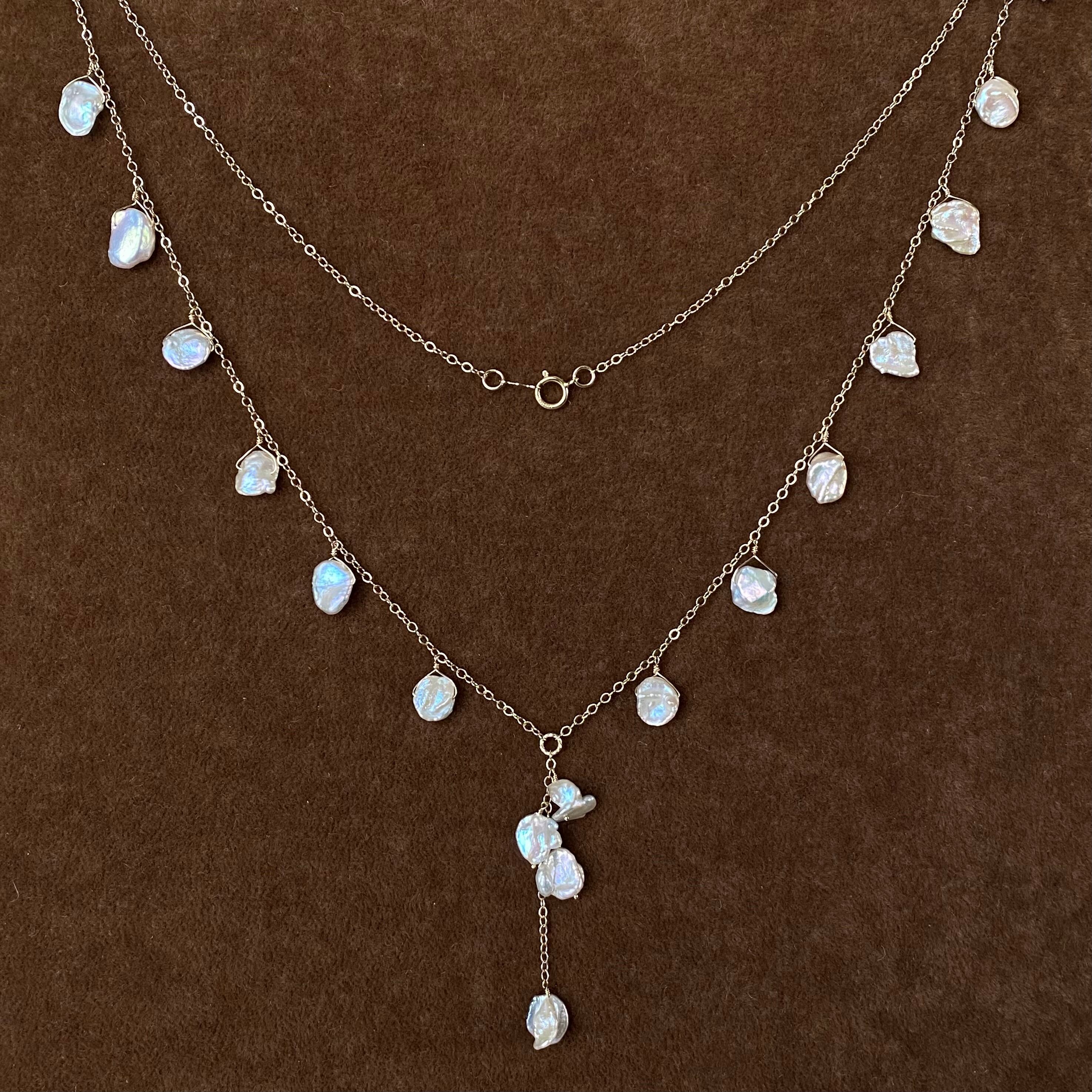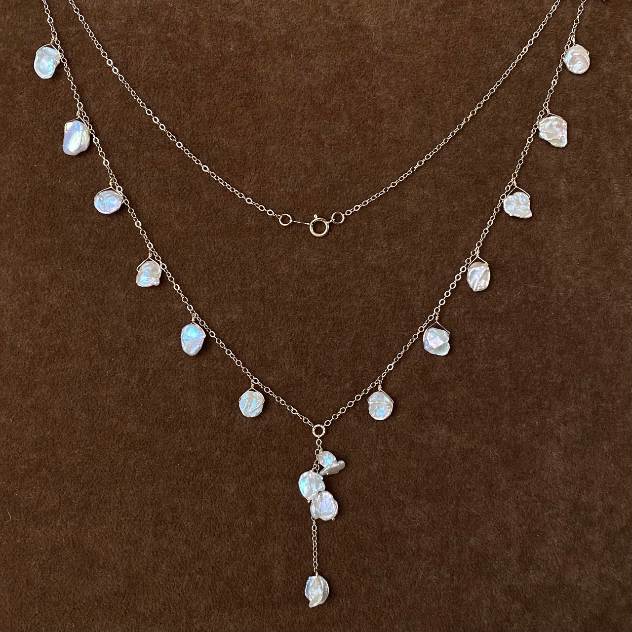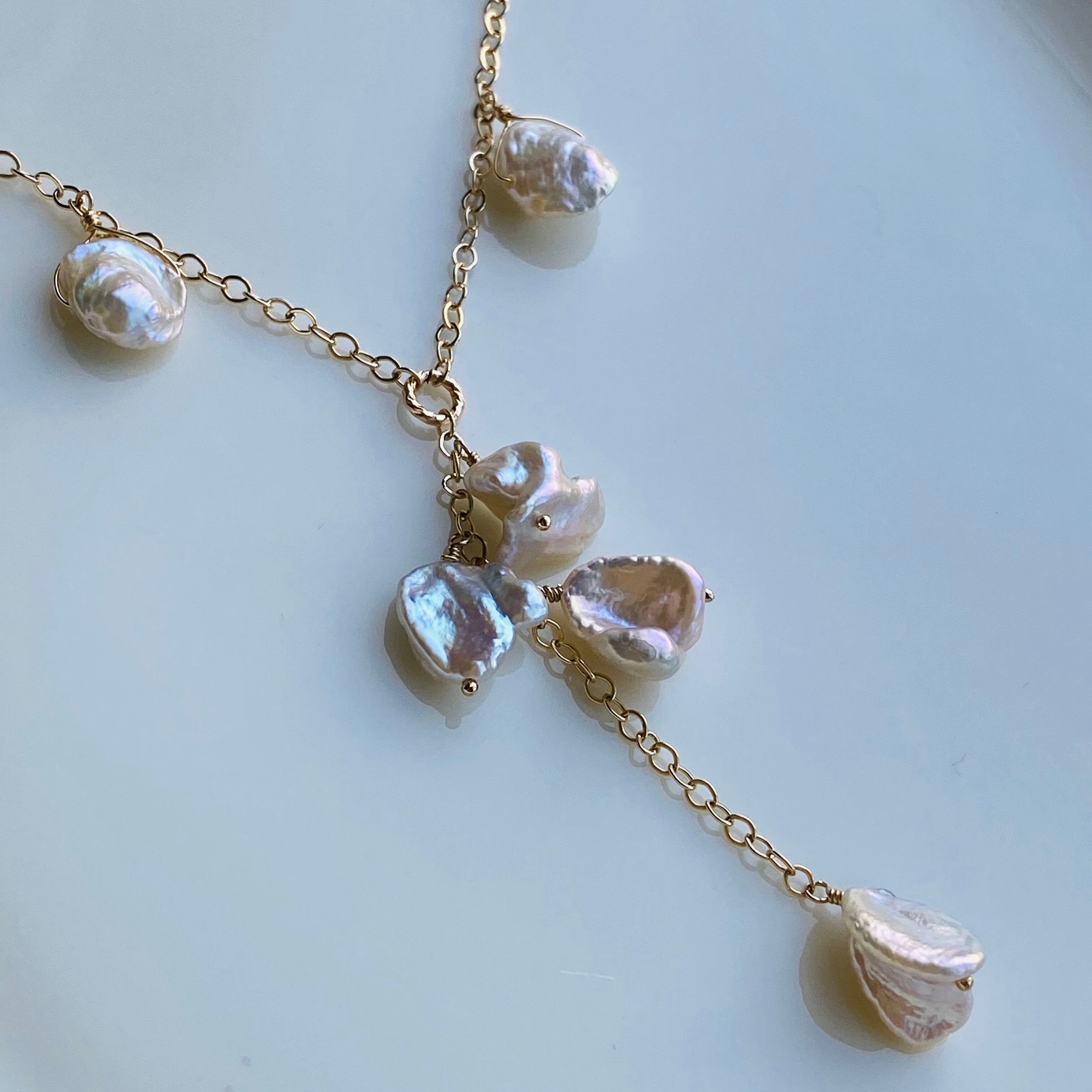 薄くピンクがかった花びらのような繊細さを持つ淡水パールを14kgfの細めのチェーンに丁寧に一つずつワイヤーで繋いでいきました。