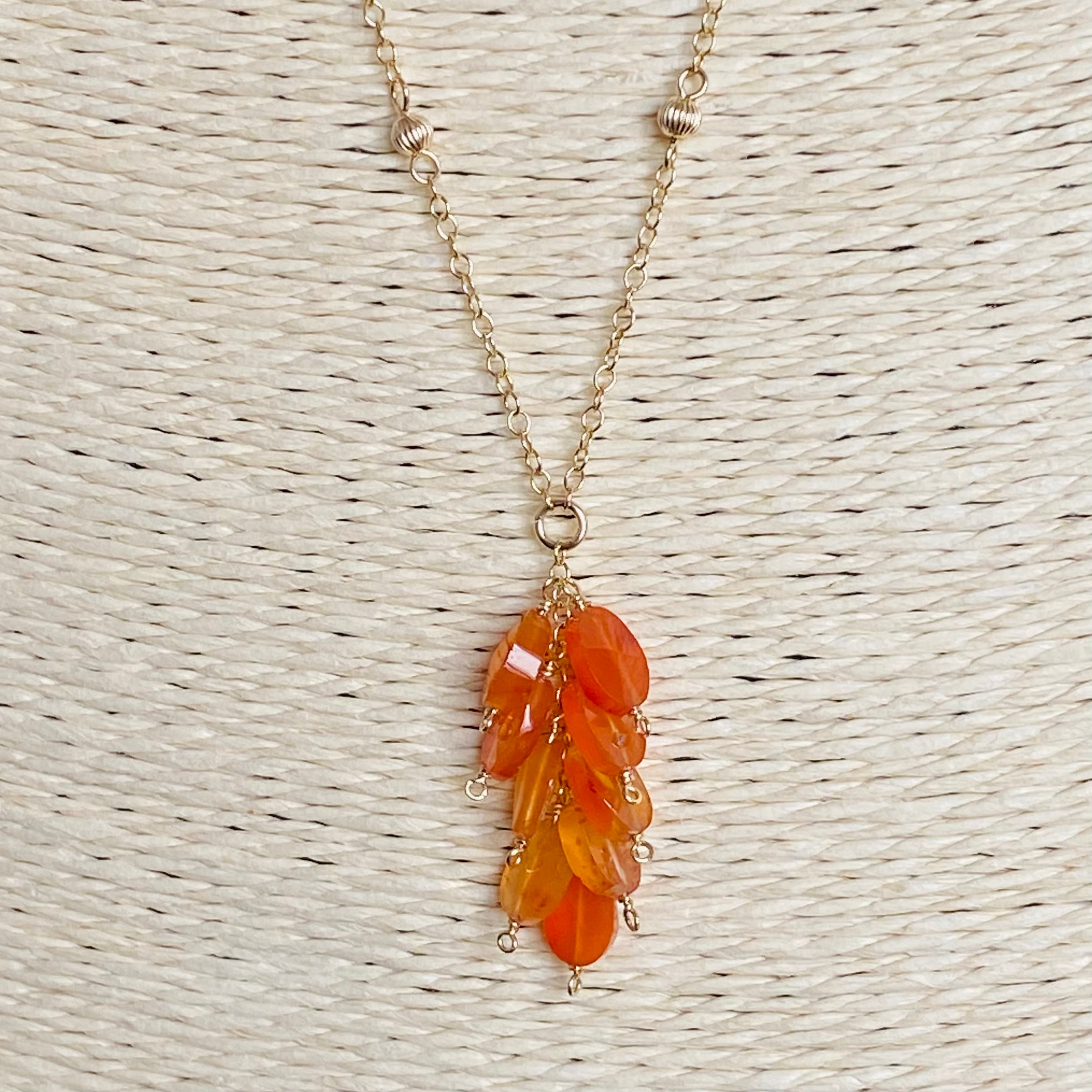 トップにはカーネリアンを9粒、房のようにチェーンに繋ぎました。