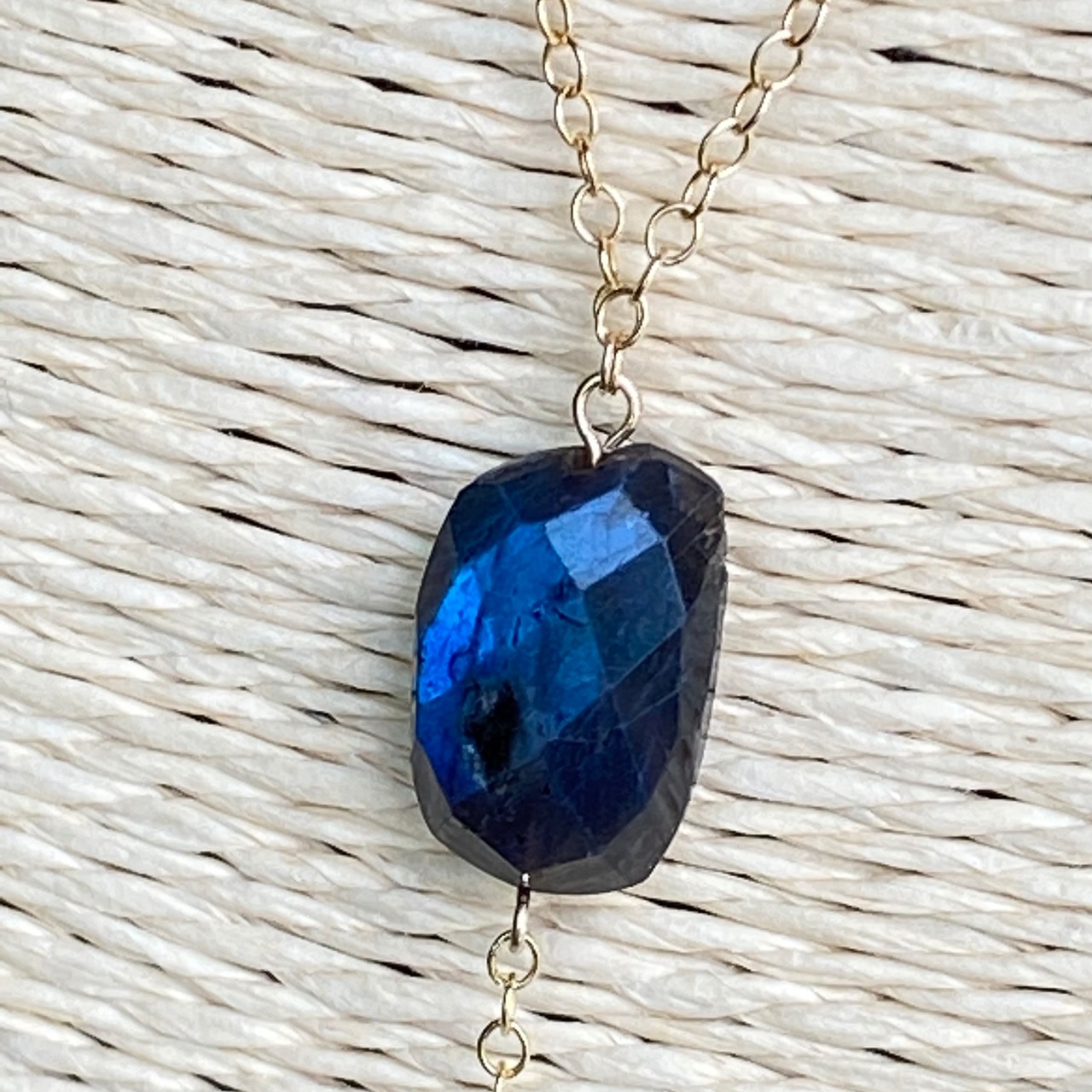 メインのタンブルのラブラドライトは濃いブルーの中に鮮やかなブルーのラブラドレッセンスが見られ、まるでベルベットのような上品な輝きです。