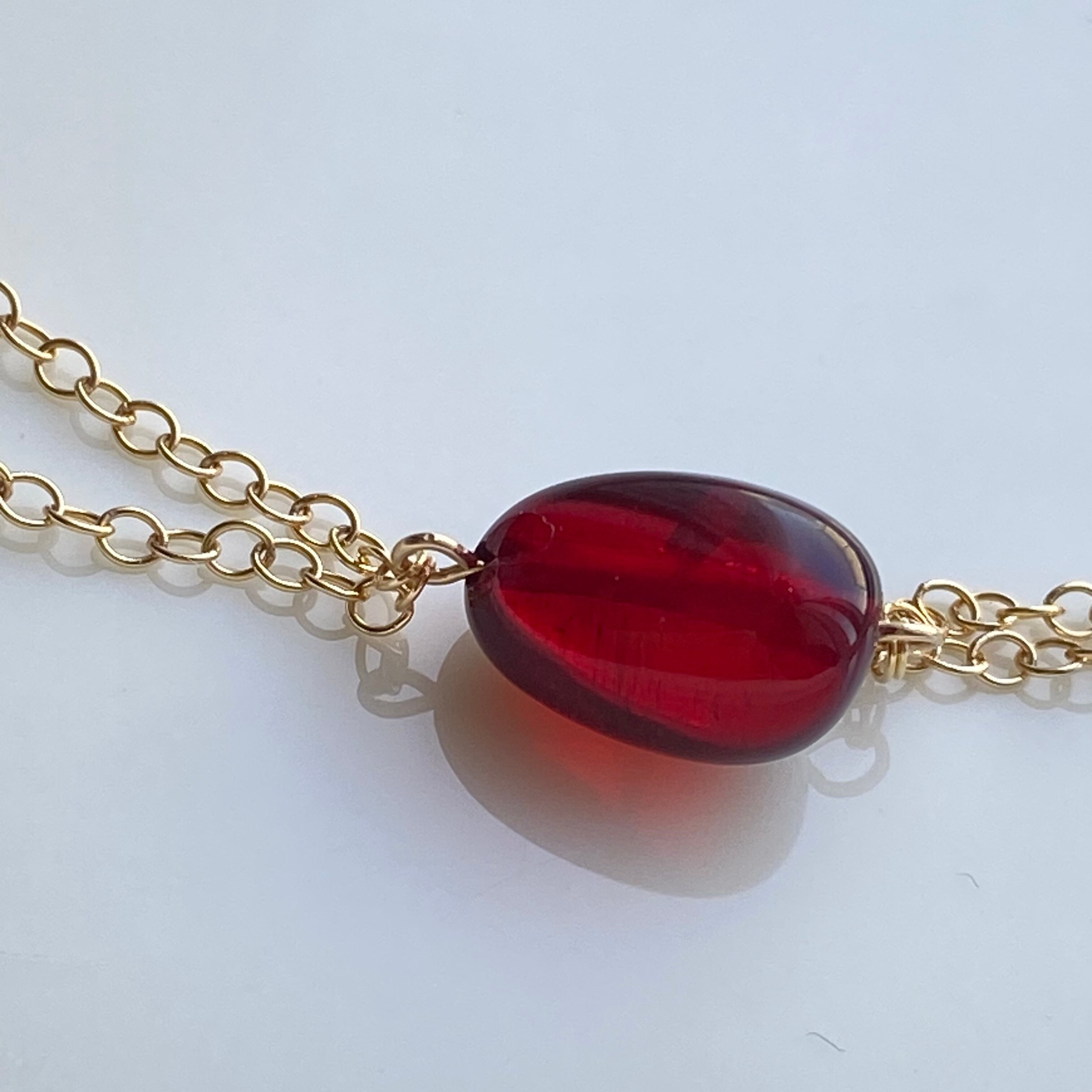 ハーブでカラーリングした鮮やかな赤が目を奪うアンバーのネックレス。