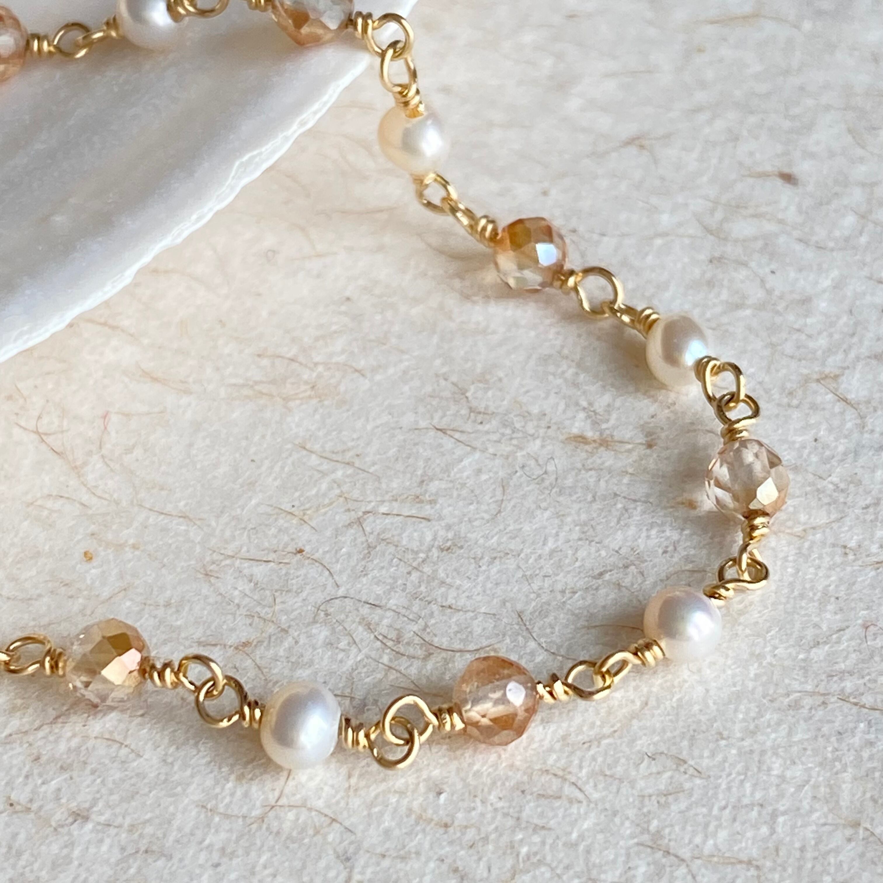 艶のある淡水パールと、カット面がキラキラと輝くゴールデンオーラを交互に繋ぎました。